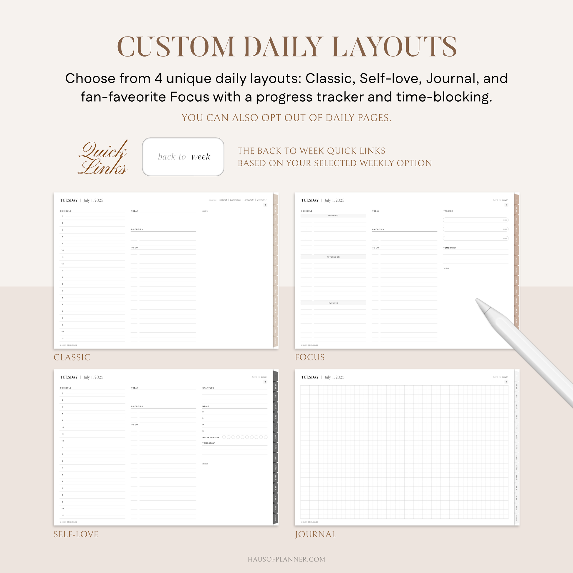 - Daily Options: Choose from 4 daily layouts: Classic, Self-Love, Journal, or Focus when downloading you planner. Each includes weekly quick links back to the week view.