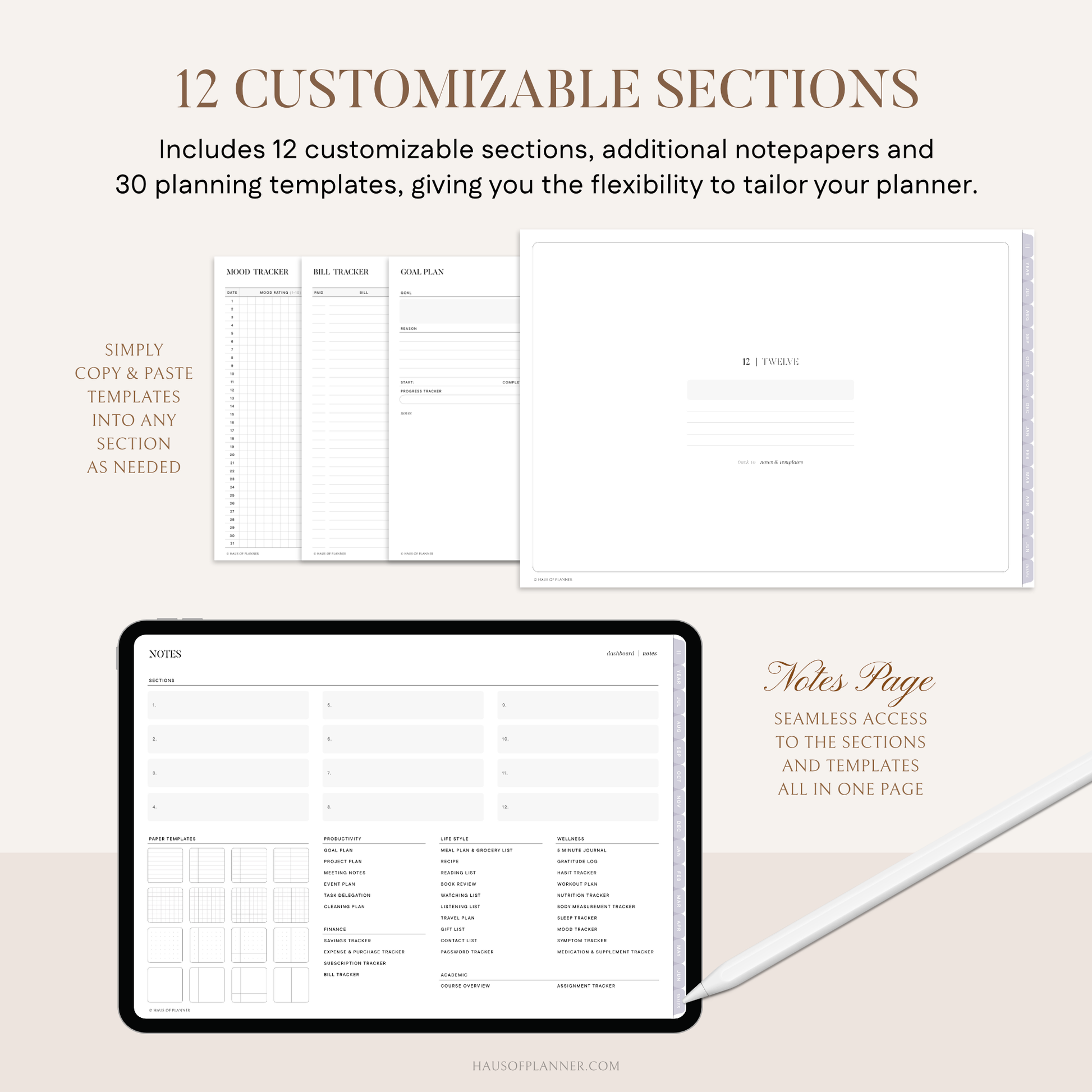 - Notes Dashboard: Hyperlinks to 12 sections, notepapers, and additional templates.