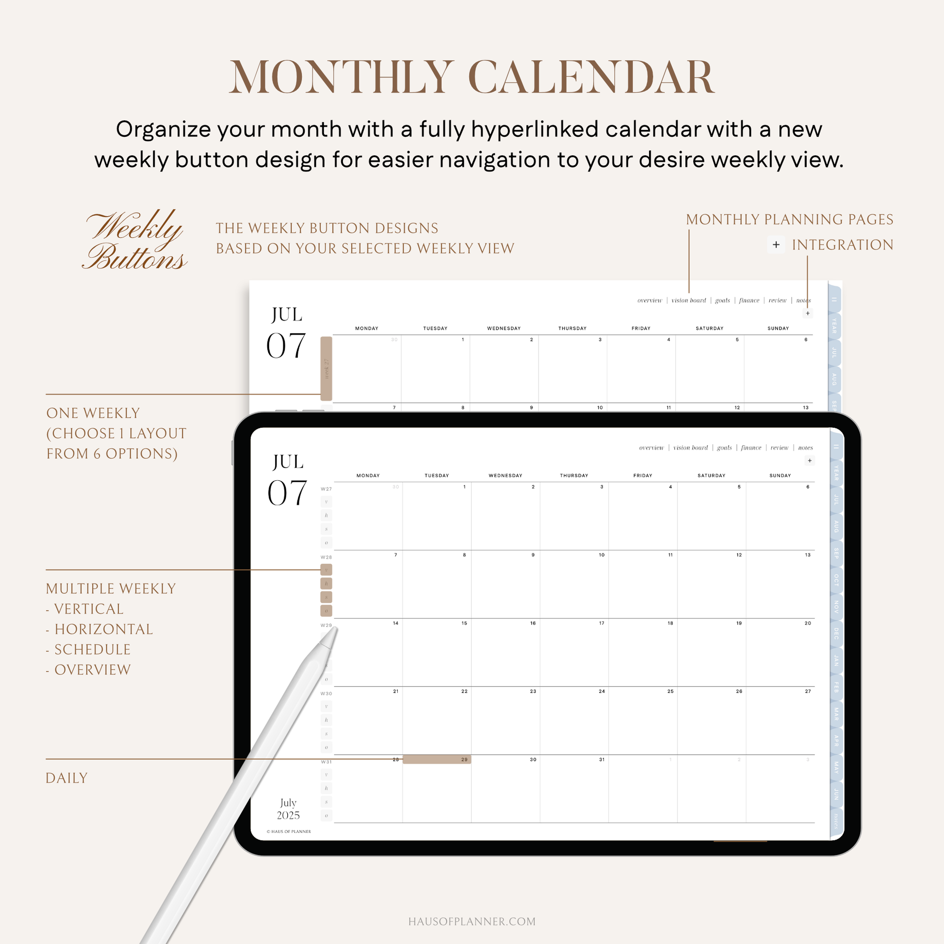 - 12 Monthly Calendars: Hyperlinked to daily and weekly pages, including new 4 or 1 weekly link buttons per week, based on your selected weekly layout.