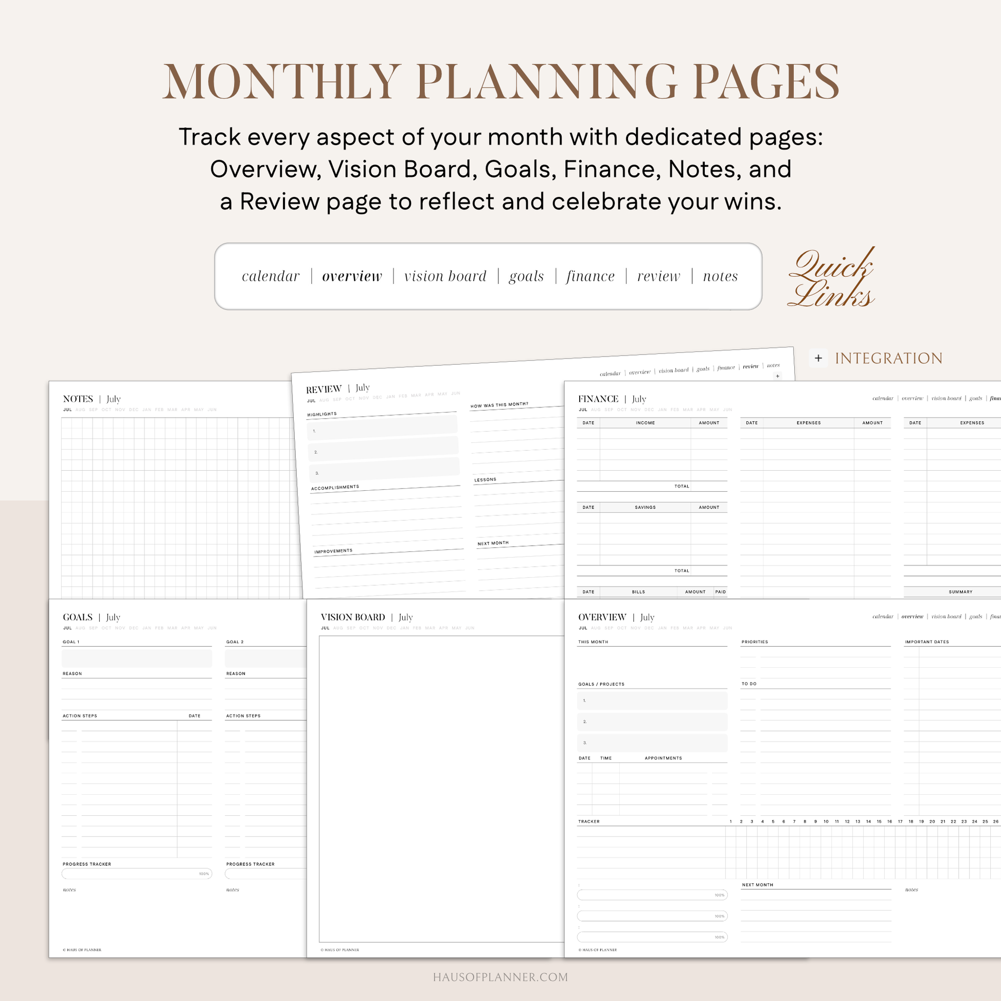 - 6 Monthly Planning Pages: Overview, Vision Board, Goals, Finance, Review, and Notes. These pages are accessible via monthly quick links, with 12 monthly links connecting the same planning pages across all months.