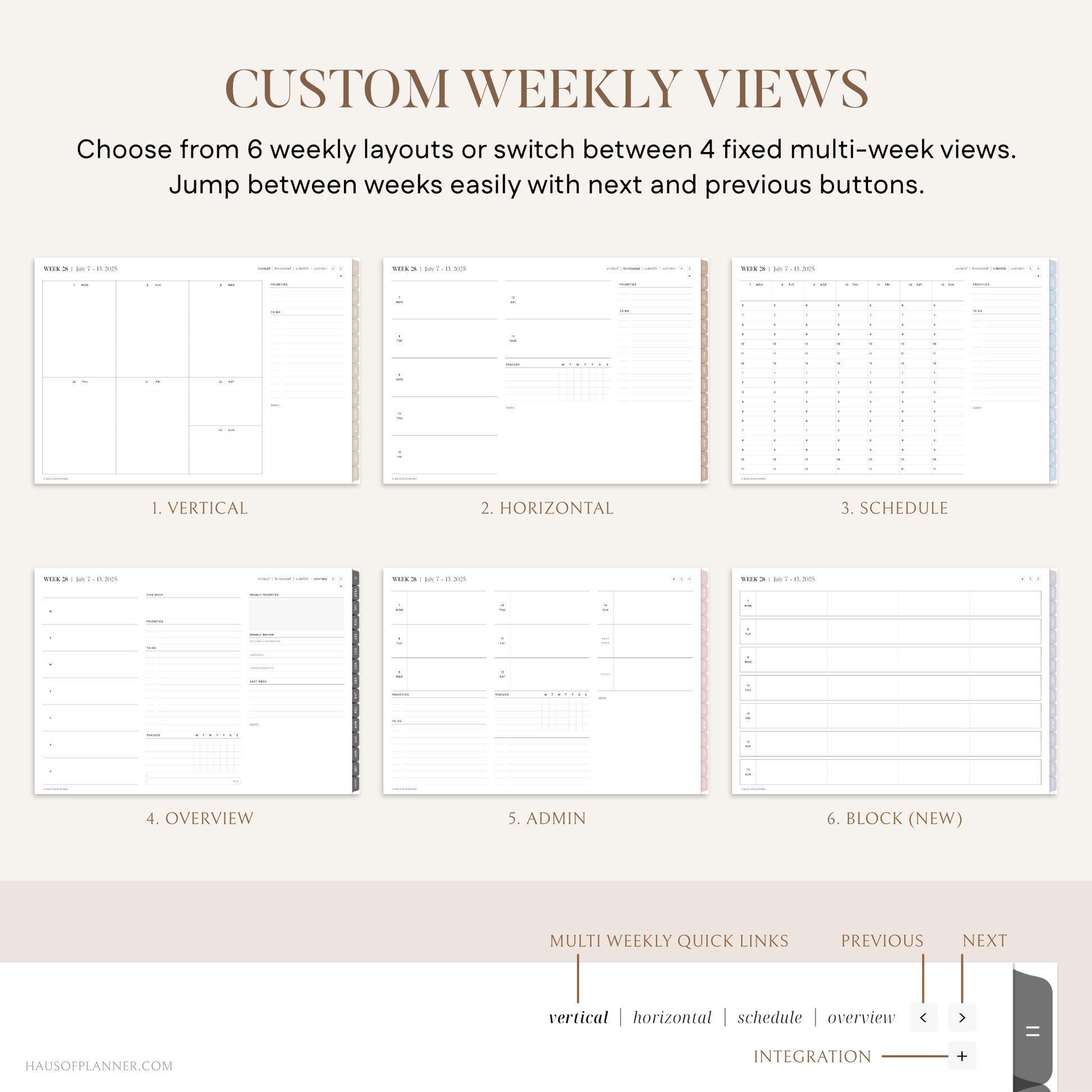 - Daily Options: Choose from 4 daily layouts: Classic, Self-Love, Journal, or Focus when downloading you planner. Each includes weekly quick links back to the week view.