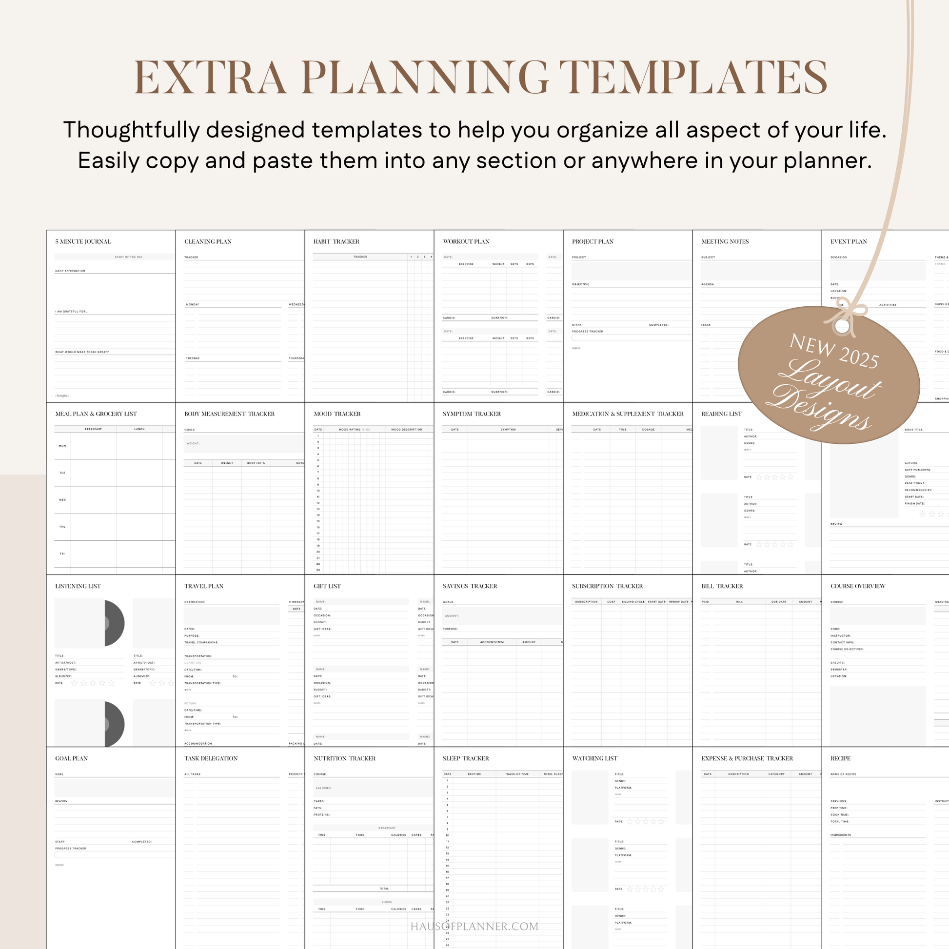 - 32 Extra Planning Templates: Goal Plan, Project Plan, Meeting Notes, Event Plan, Task Delegation, Cleaning Plan, Meal Plan & Grocery List, Recipe, Reading List, Book Review, Watching List, Listing List, Travel Plan, Gift List, Contact List, Password Tracker, Saving Tracker, Expense & Purchase Tracker, Subscription Tracker, Bill Tracker, Course Overview, and Assignment Tracker.