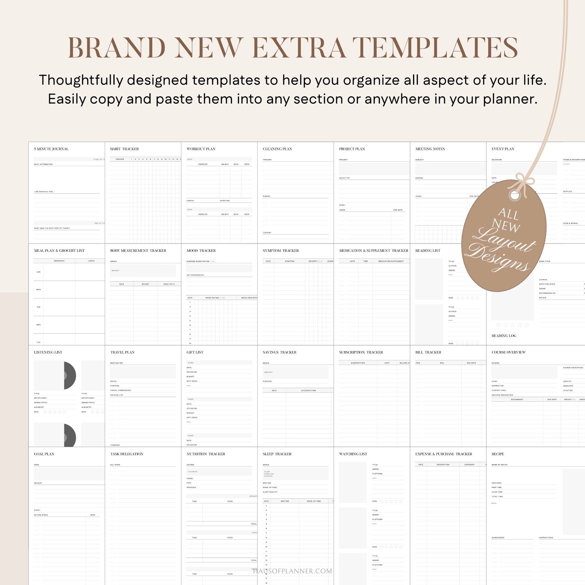 - 32 New Additional Planning Templates: Goal Plan, Project Plan, Meeting Notes, Event Plan, Task Delegation, Cleaning Plan, Meal Plan & Grocery List, Recipe, Reading List, Book Review, Watching List, Listing List, Travel Plan, Gift List, Contact List, Password Tracker, Saving Tracker, Expense & Purchase Tracker, Subscription Tracker, Bill Tracker, Course Overview, and Assignment Tracker.