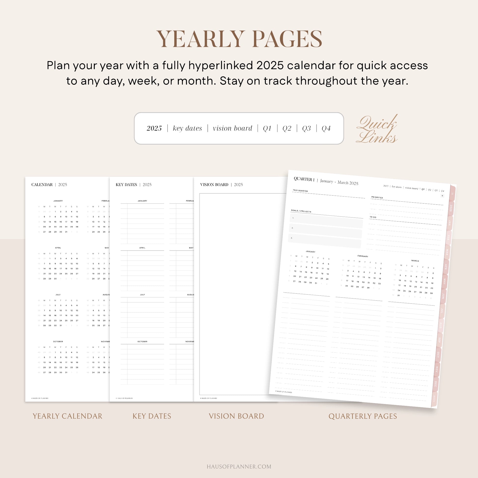 - 4 Quarterly Planning Pages: Accessible via quick links from the yearly view, allowing easy switching between the yearly calendar, key dates, vision board, and quarterly planning pages.