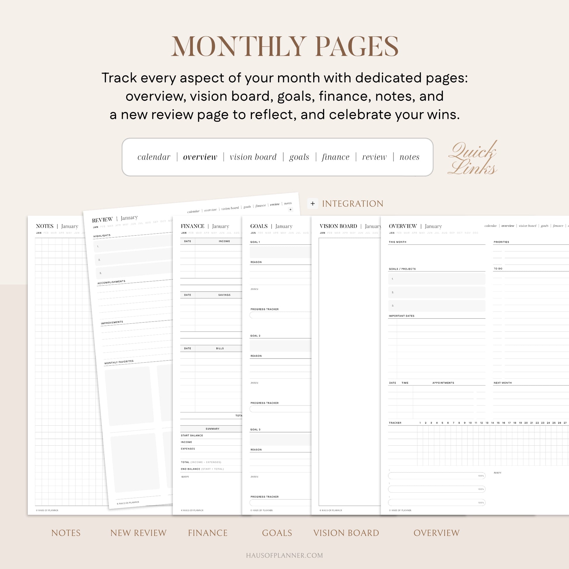 - 6 Monthly Planning Pages: Overview, Vision Board, Goals, Finance, New Review, and Notes. These pages are accessible via monthly quick links, with 12 monthly links connecting the same planning pages across all months.