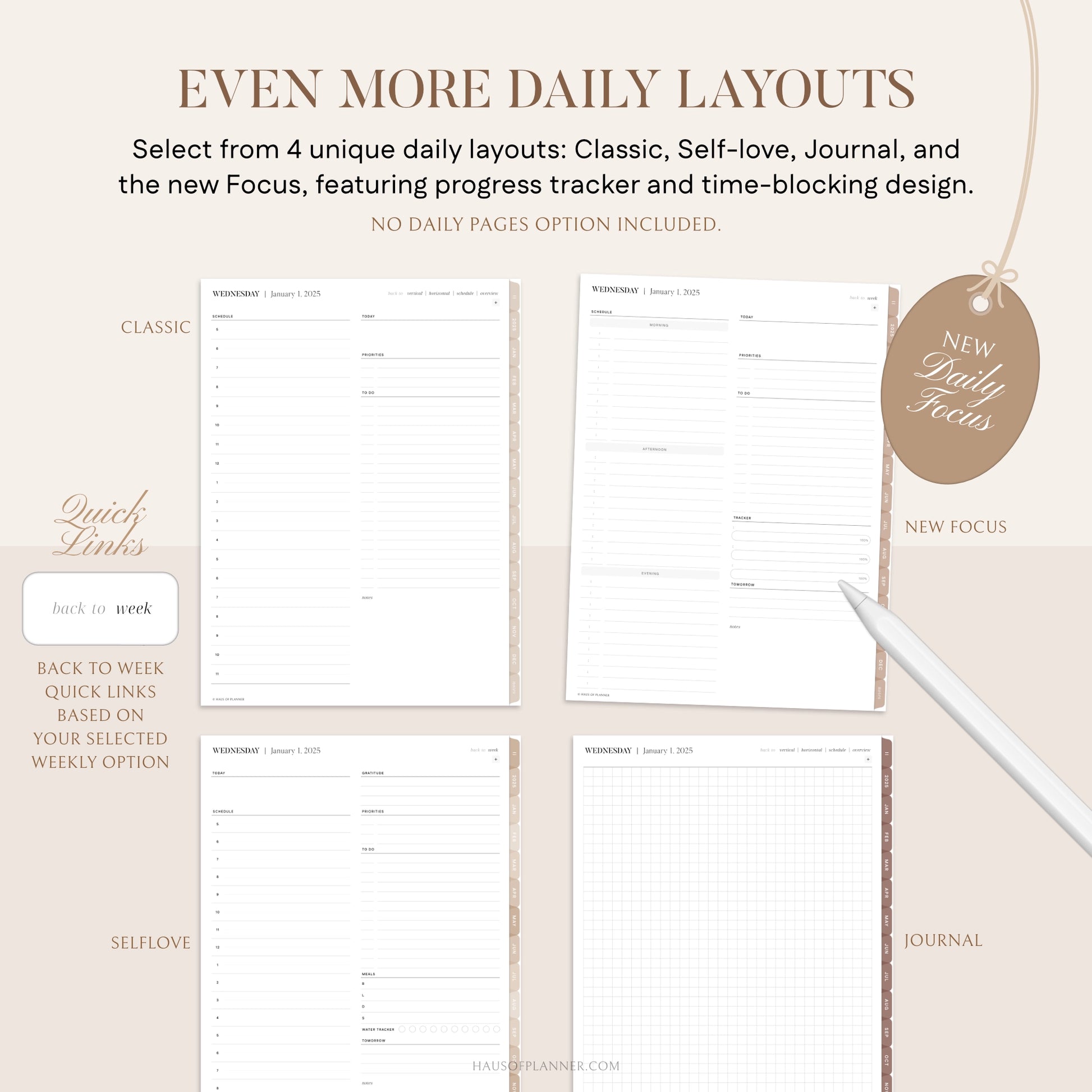 - 4 Daily Layouts: Choose from Classic, Self-Love, Journal, or the new Focus layout at download, with weekly quick links back to the week view.