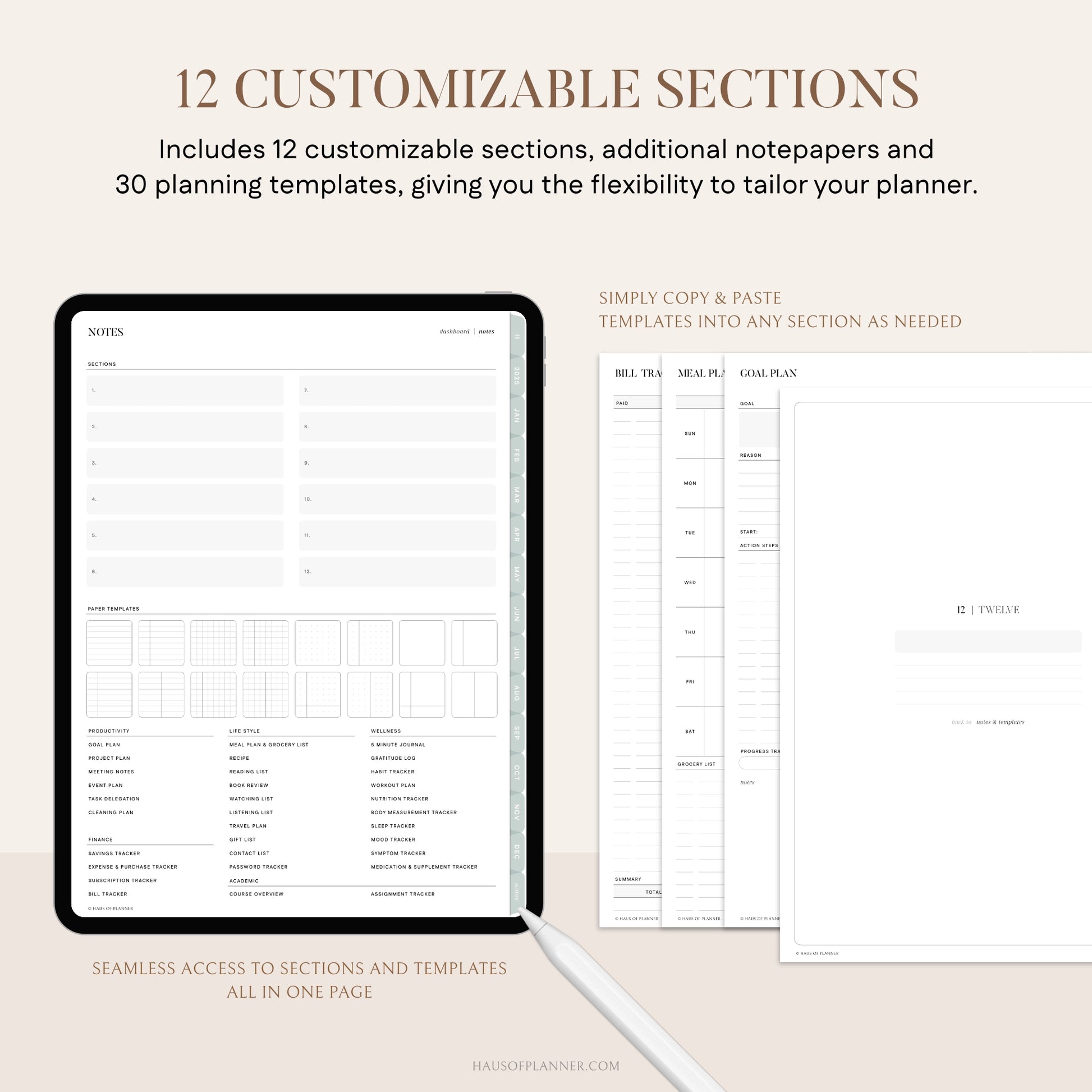 The planner includes yearly, quarterly, monthly, weekly, and daily pages, featuring updated designs, 9 color themes, and new weekly and daily layout options. Plus, 12 sections with all-new notepaper and template designs, bringing you the most customizable planner from Haus of Planner yet.