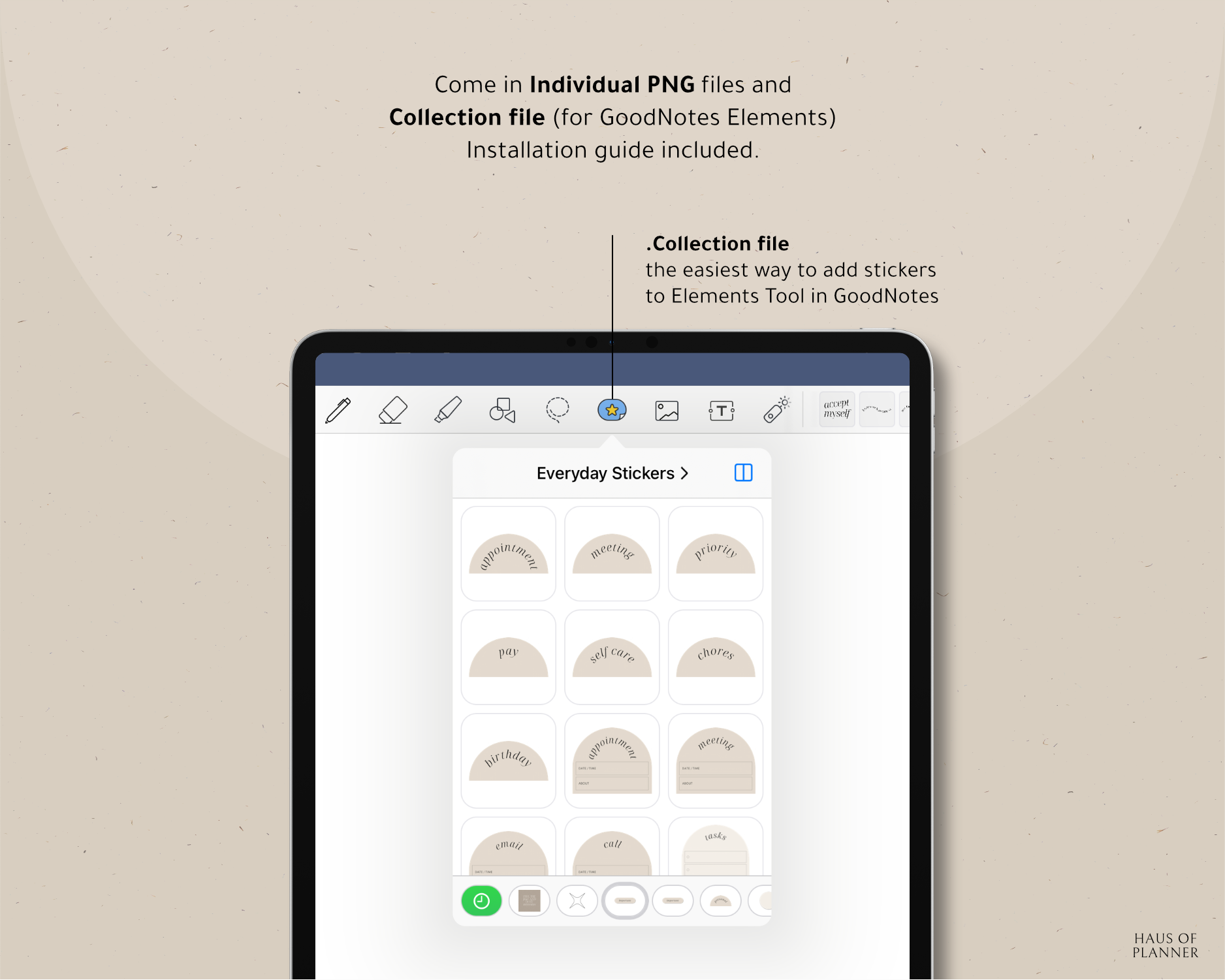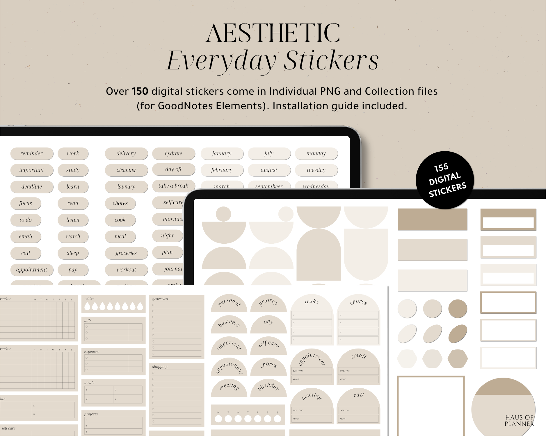 Elevate day to day planning with 155 Aesthetic Everyday digital stickers. Come in Individual PNG and Collection files (for GoodNotes Elements). Installation guide included.