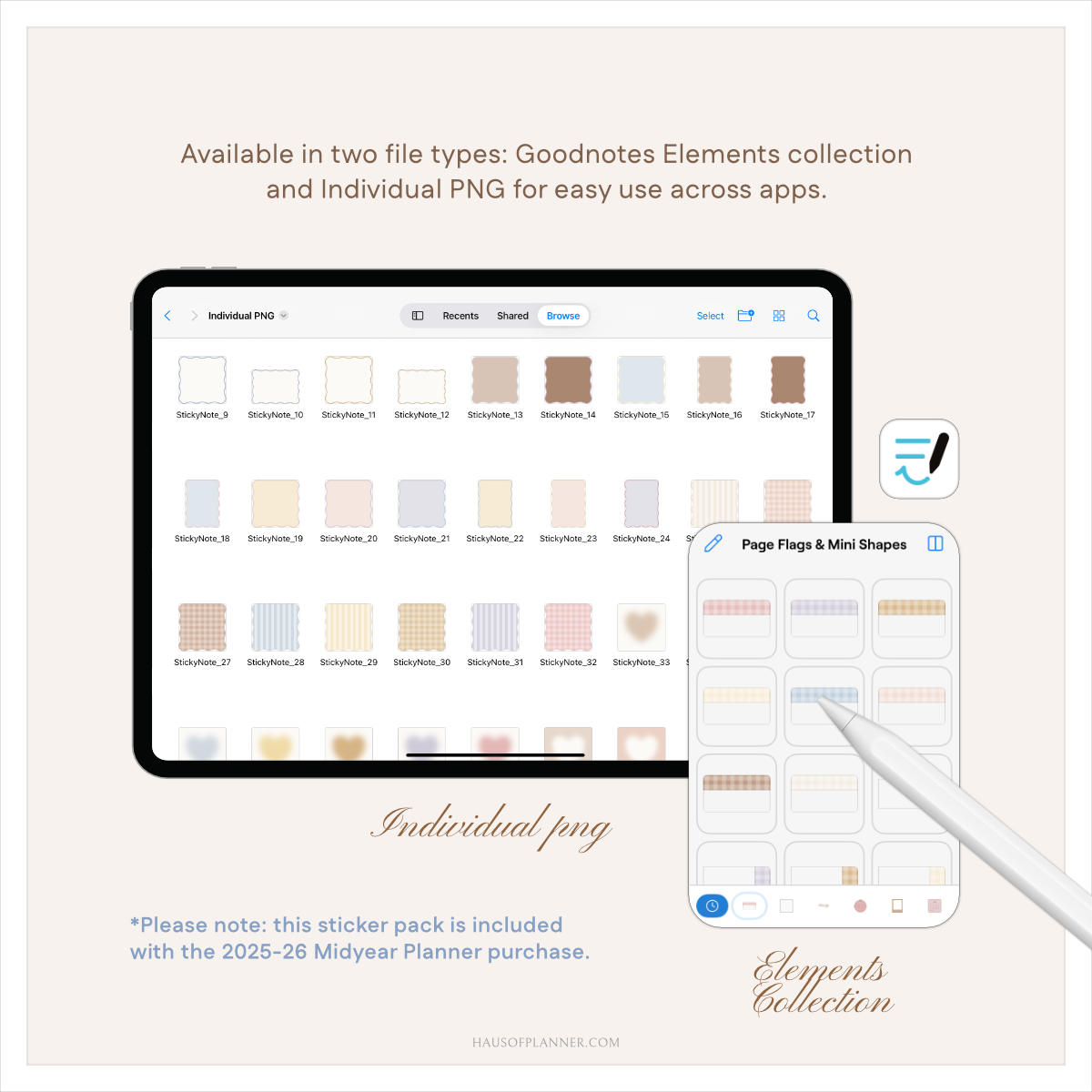 Available in Goodnotes Elements collections and individual PNG files, with a video installation guide included for easy setup.